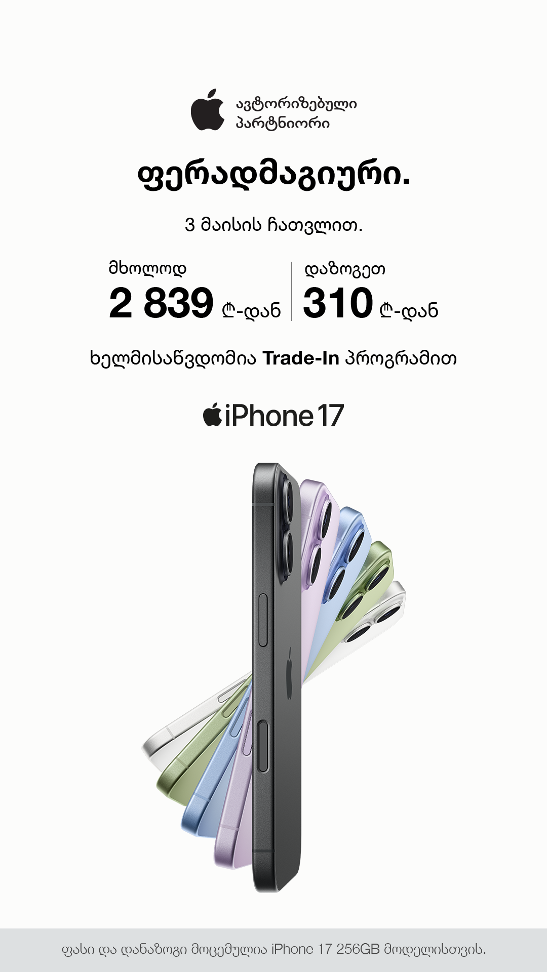 - iPhone 17 - დახვეწილი, სწრაფი და უნივერსალური მოდელი ყოველდღიური გამოყენებისთვის. გამოირჩევა მაღალი წარმადობით, ხარისხიანი კამერითა და ელეგანტური დიზაინით.