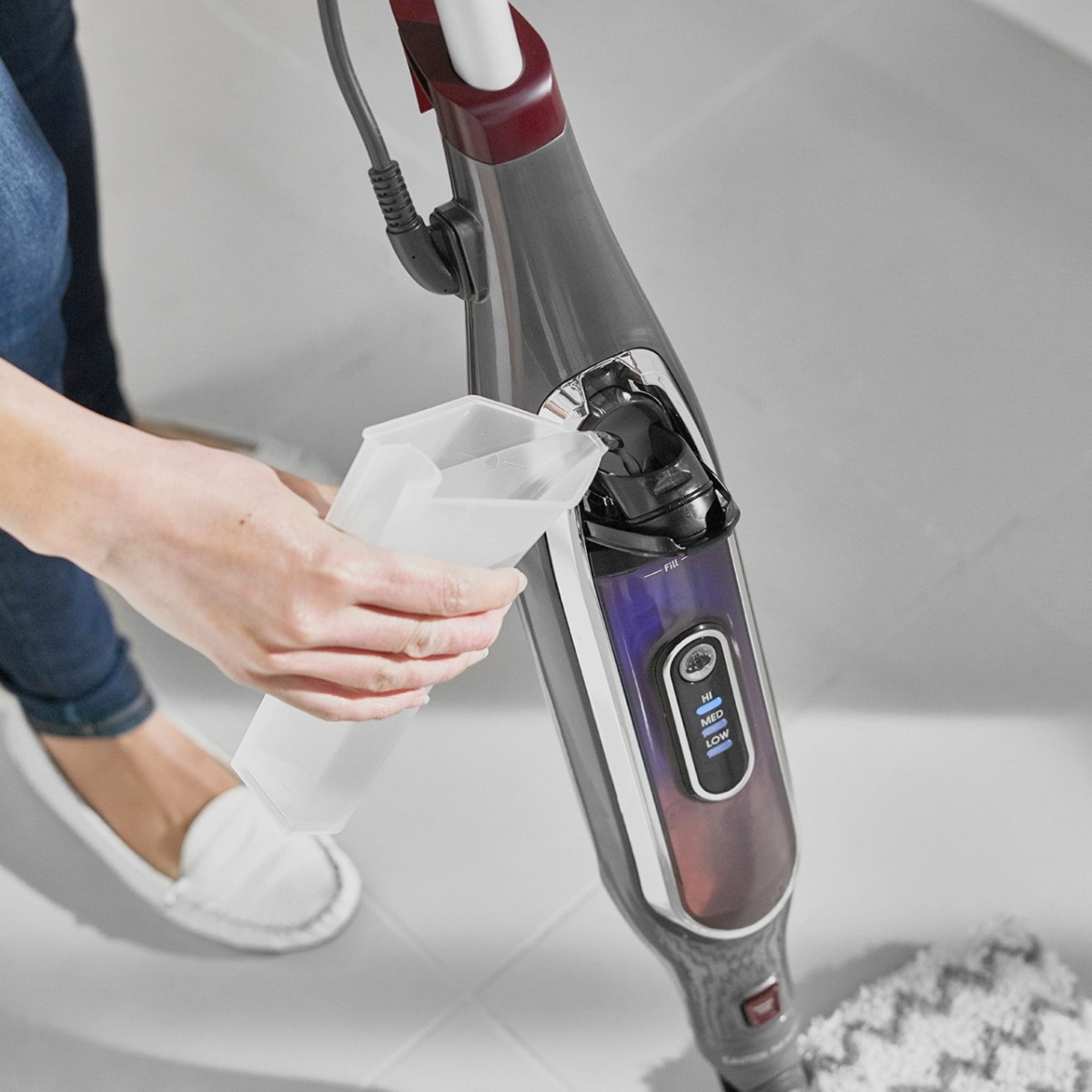 - Plug in the steam mop and turn it on.