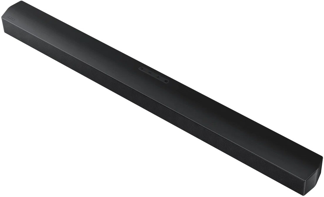 The black finish blends with most TVs and home decor. The low profile keeps the screen view unobstructed. It pairs easily with current Samsung TVs and other brands through standard audio connections.