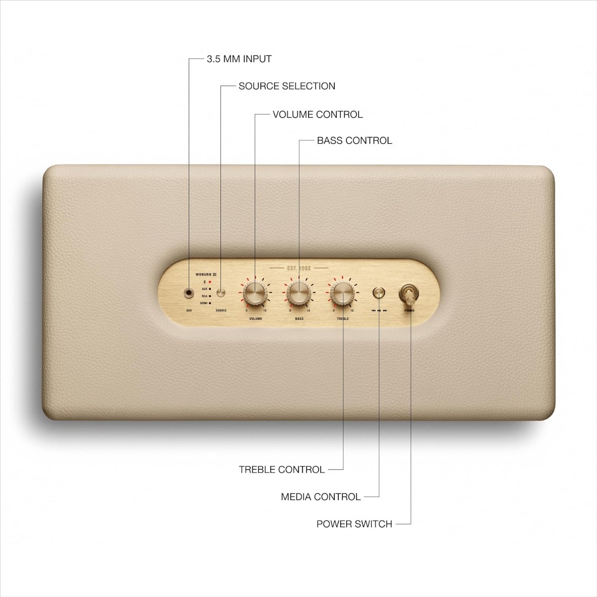 კრემისფერი კორპუსი და კლასიკური Marshall-ის სტილი იდეალურად ერწყმის როგორც თანამედროვე, ისე კლასიკურ ინტერიერს. დინამიკი ვიზუალურადაც დეკორის ელემენტად გამოიყურება და არა მხოლოდ ტექნიკად.
