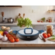 შავი/ლურჯი ფერის თანამედროვე დიზაინი ვიზუალურად გამორჩეული და პრაქტიკულია. მოხერხებული სახელური უზრუნველყოფს უსაფრთხო და კომფორტულ გამოყენებას. ტაფა-ქვაბი თავსებადია სხვადასხვა ტიპის სითბურ წყაროსთან, მათ შორის გაზისა და ელექტრო ქურებთან.